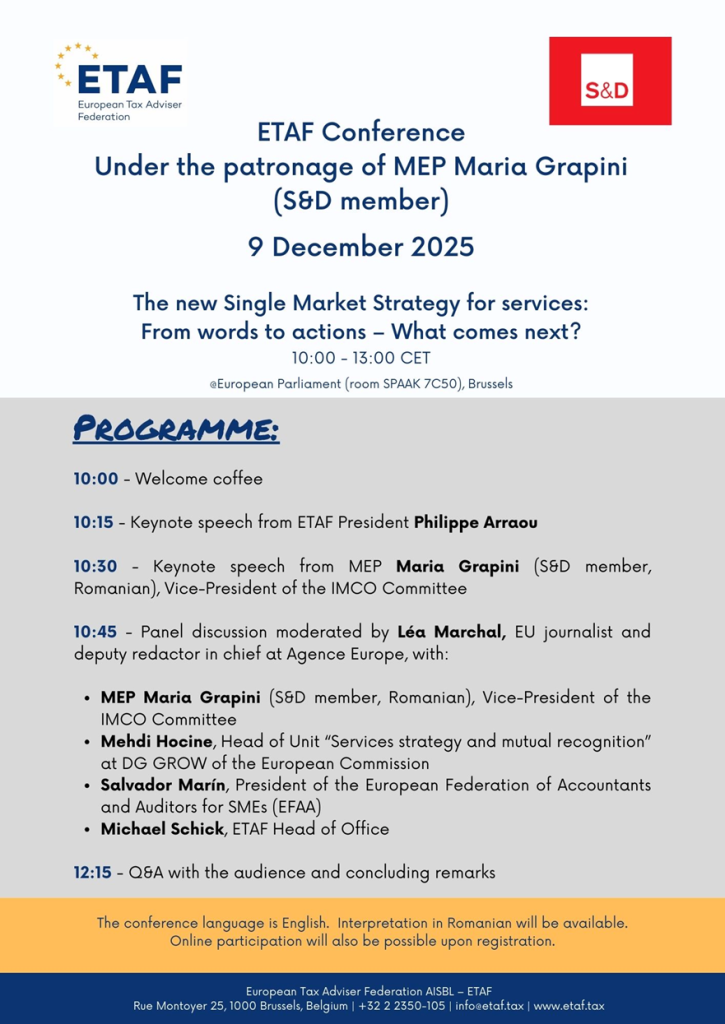Marți, 9 decembrie 2025, în intervalul 11:00–13:00 (ora României), European Tax Adviser Federation (ETAF) organizează, sub patronajul eurodeputatului Maria Grapini, conferința cu tema Noua strategie privind piața unică a serviciilor – De la vorbe la fapte: ce urmează?.